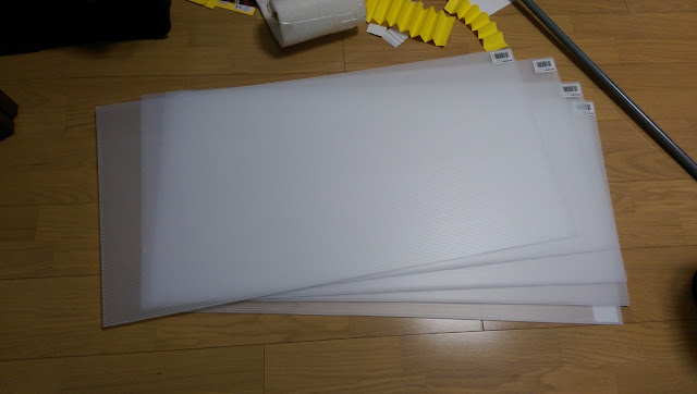 I settled upon using corrugated plastic sheets that were available from my local hardware store in dimensions of 91 cm x 45 cm. The thickness of the corrugated sheet is about 2 mm. This construction is extremely lightweight, while the corrugation provides some degree of structural strength.
